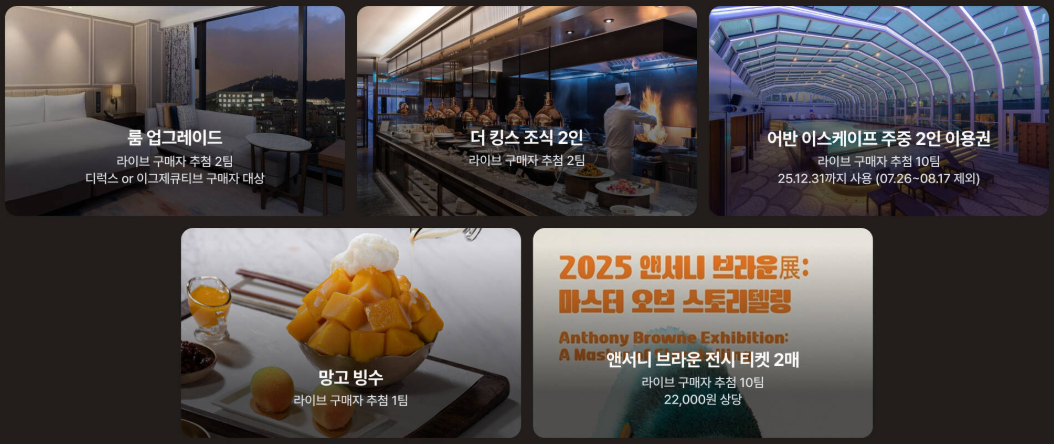 - 룸 업그레이드(라이브 구매자 추첨 2팀-디럭스 or 이그제큐티브 구매자)